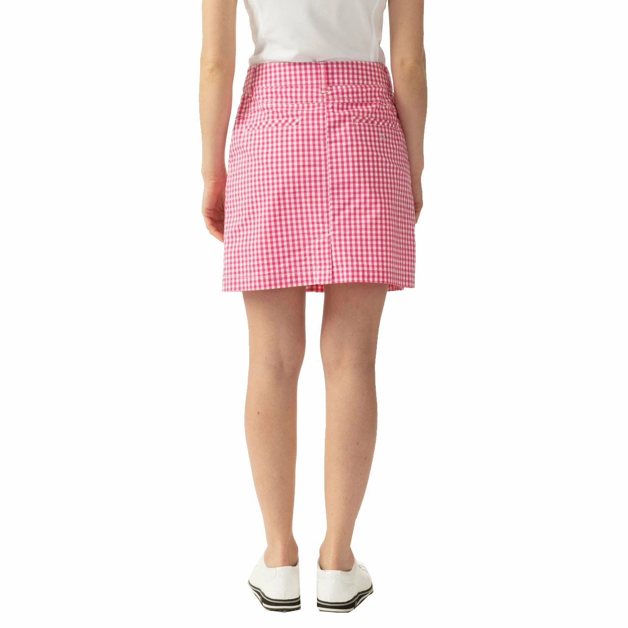 Add a pop of color to your golf wardrobe with the Daily Sports Diane 18in Womens Golf Skort. Made with a woven fabric, this skort will keep you comfortable and looking good throughout your round. It features an all over yarn dyed check pattern, two front and two back pockets so you can store your tees and scorecard, and attached inner shorts for added coverage when you bend over to pick up your ball.
