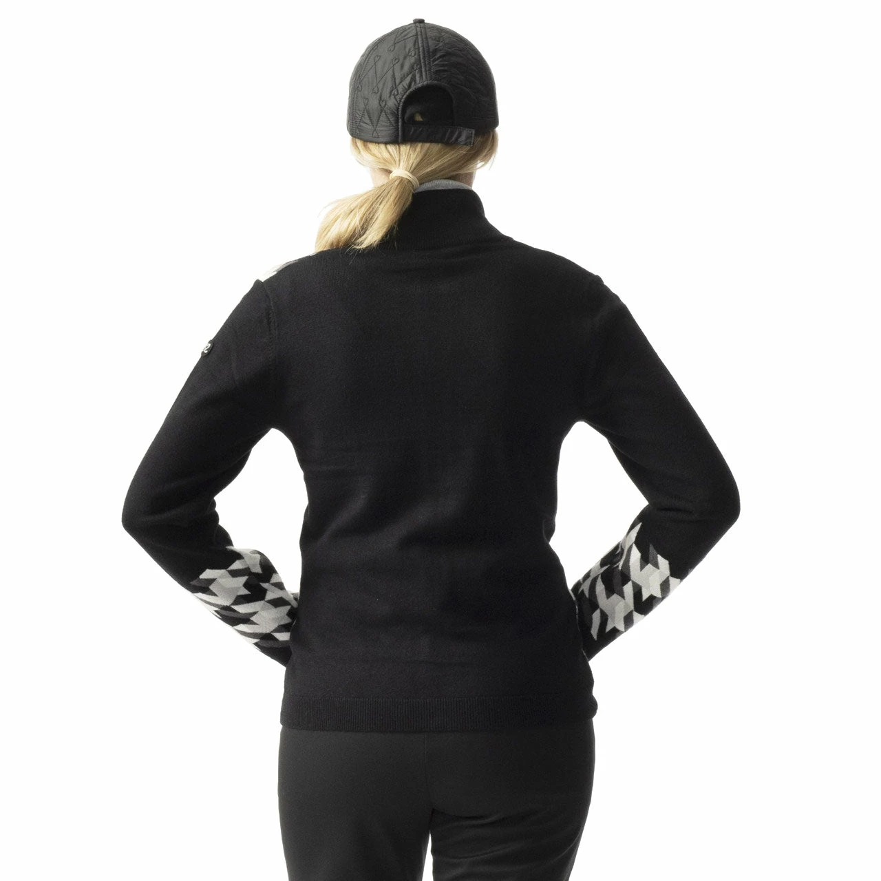 Stand out from your competition with the Daily Sports Simone Womens Golf Sweater. This regular fit sweater features a black and white houndstooth print for an eye-catching look and a full zip closure so it can be worn as a jacket.