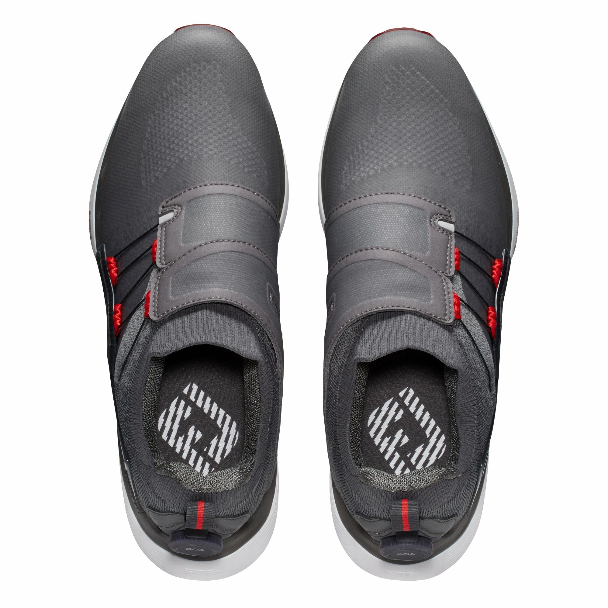The FootJoy HyperFlex Boa Golf Shoes deliver ultimate waterproof breathability for any conditions. These shoes are built with a breathable mesh upper that is lined with a membrane barrier for awesome waterproof protection and the StratoFoam Cushioning System will absorb shock for maximum comfort that will minimize and reduce underfoot fatigue. The OptiFlex outsole features properly placed flex grooves so the shoe flexes in the right location during the golf swing and Pulsar soft spikes and molded traction provide grip in all conditions. There is also a super soft ribbed knit cuff that will surround the foot for no-slip fit that adds to the comfort.