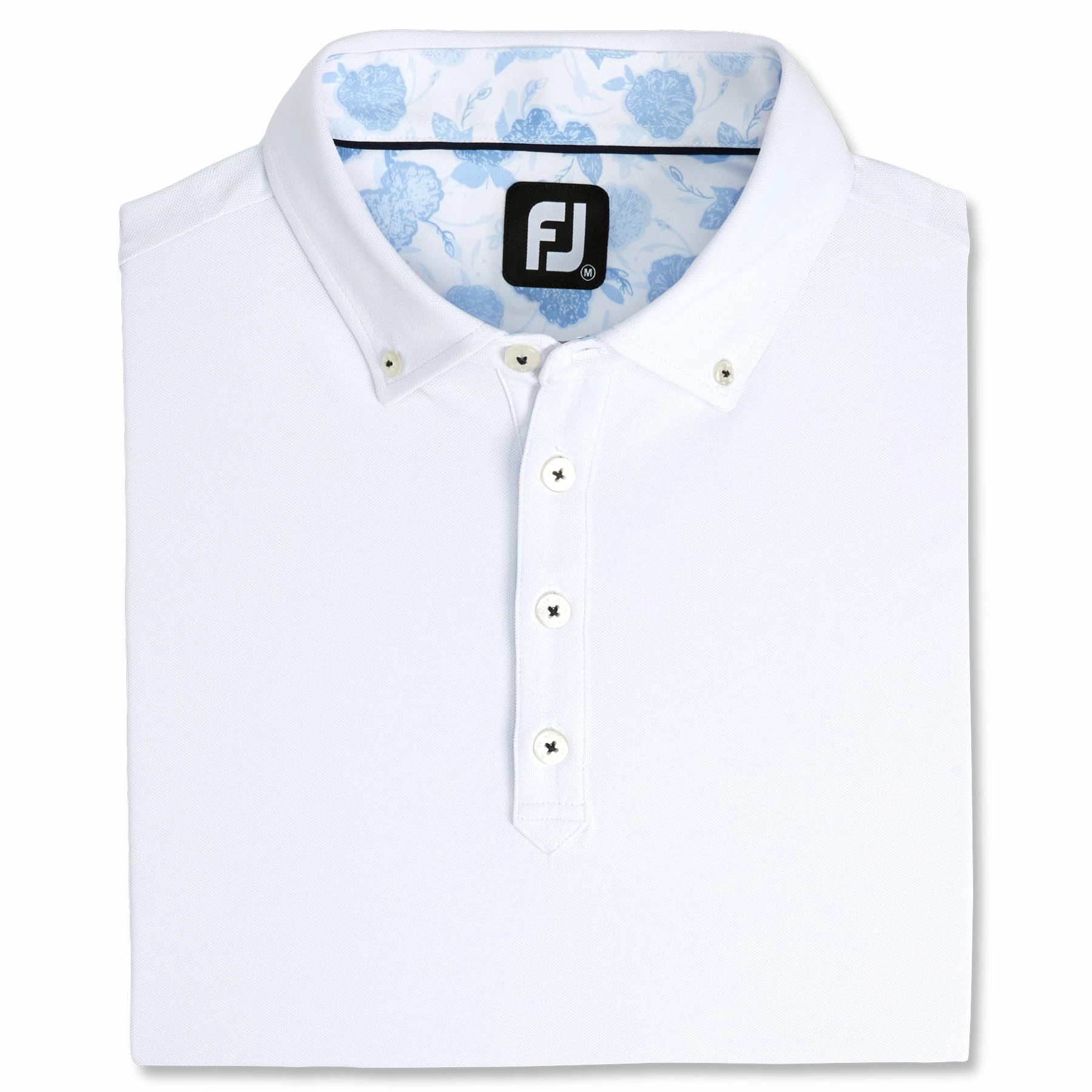 Take to the course with comfort, style and performance with the FootJoy Stretch Pique Vintage Floral Trim Golf Polo. This polo has been built with the FootJoy Exclusive ProDry fabric that provides superior moisture control by wicking water away quickly while also providing a four-way stretch that will keep you dry and comfortable throughout the round. There is an anti-microbial technology that prevents odor build up to keep you smelling fresh and the extended back shirt tail makes tucking it in a breeze. The solid pattern with longer three button placket provides a touch of style to have you looking good on and off the course.