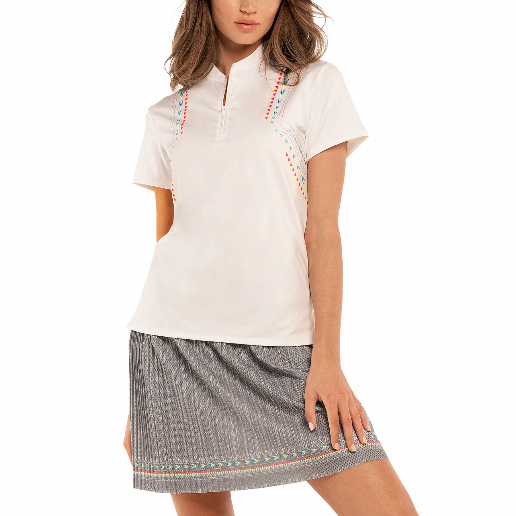 Show off your style with the Lucky in Love Quick Sand Womens Golf Polo. Bright colors and an arrowhead stripe design bring a modern vibe to this classic polo. It features a quarter zip placket, high low cut, and side slits for added breathability.